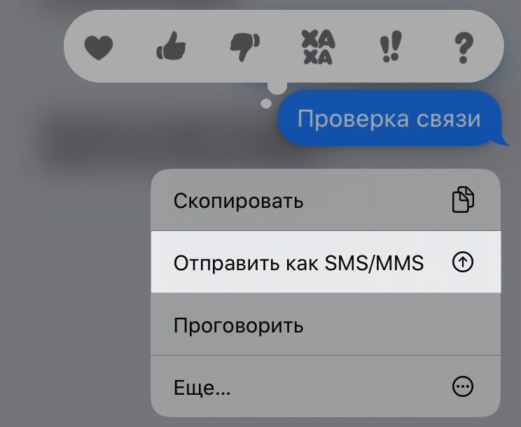 → В таком случае можно удержать на нем (сообщении) палец, и выбрать «Отправить как СМС». Сообщение тут же изменит цвет, что означает отправку как СМС.