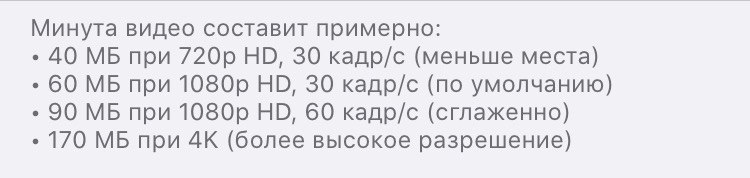 Там в графе «Запись видео» уменьши до «720р, 30 кадр/с», либо «1080р, 30 кадр/с», в зависимости от того, какое качество у тебя было выставлено до этого. Скорее всего, ты не заметишь большой разницы в качестве, а памяти при новых съемках сэкономишь достаточно много