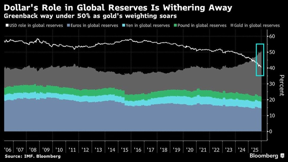 Доля доллара в мировых валютных резервах составляет около 40% — самый низкий показатель за последние 20 лет.