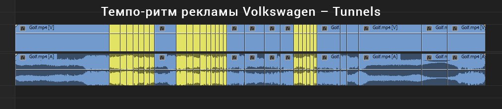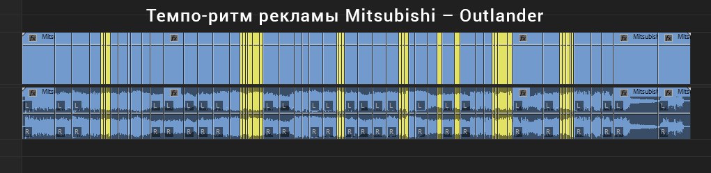 Рванный темп создается за счет коротких склеек (отмечены желтым). Как правило, такие склейки усиливаются ярким саундом. Обратите внимание, как эти склейки становятся чаще к финалу видео.