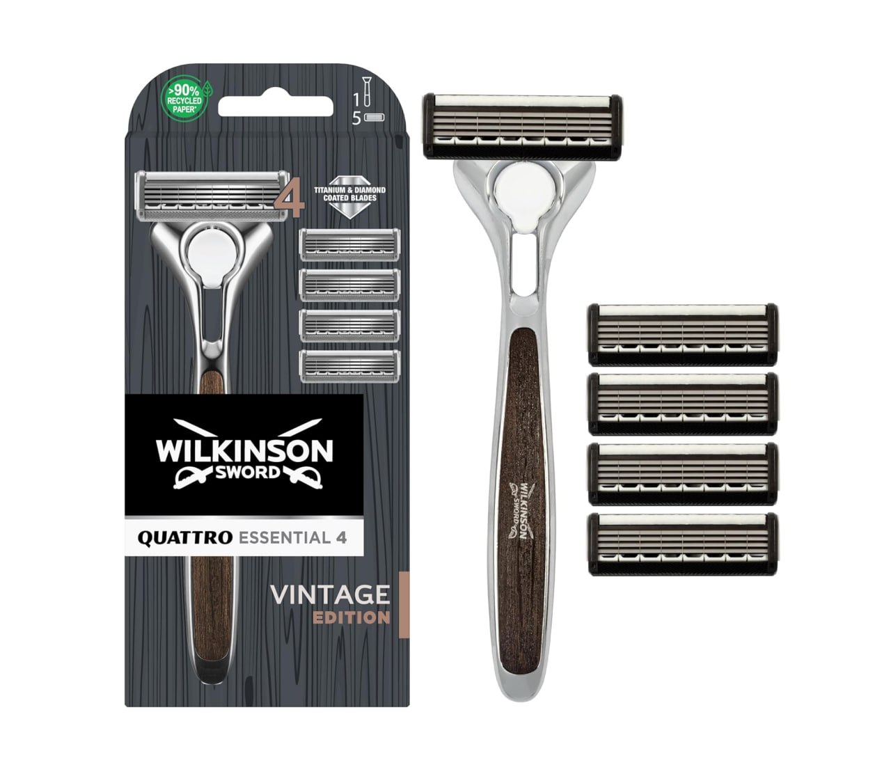 Maquinilla de afeitar de 4 hojas revestidas de titanio Wilkinson Sword Quattro Vintage Edition, con 5 cuchillas de recambio con banda lubricante
