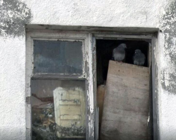 По рассказам соседей, много лет назад в квартире был пожар. Жильцы заколотили окно досками и съехали в другое жилье, которое им предоставил муниципалитет. Птицы воспользовались слабой степенью забитости оконного проема (дырой) и въехали в освободившиеся хоромы. Так и живут до сих пор.