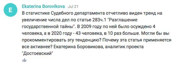В статистике Судебного департамента отчетливо виден тренд на увеличение числа дел по статье 283 ч.1 "Разглашение государственной тайны". В 2009 году по ней было осуждено 4 человека, а в 2020 году - 43 человека, в 10 раз больше. Могли бы вы прокомментировать эту тенденцию? Почему эта статья применяется все активнее? Екатерина Боровикова, аналитик проекта “Достоевский”.