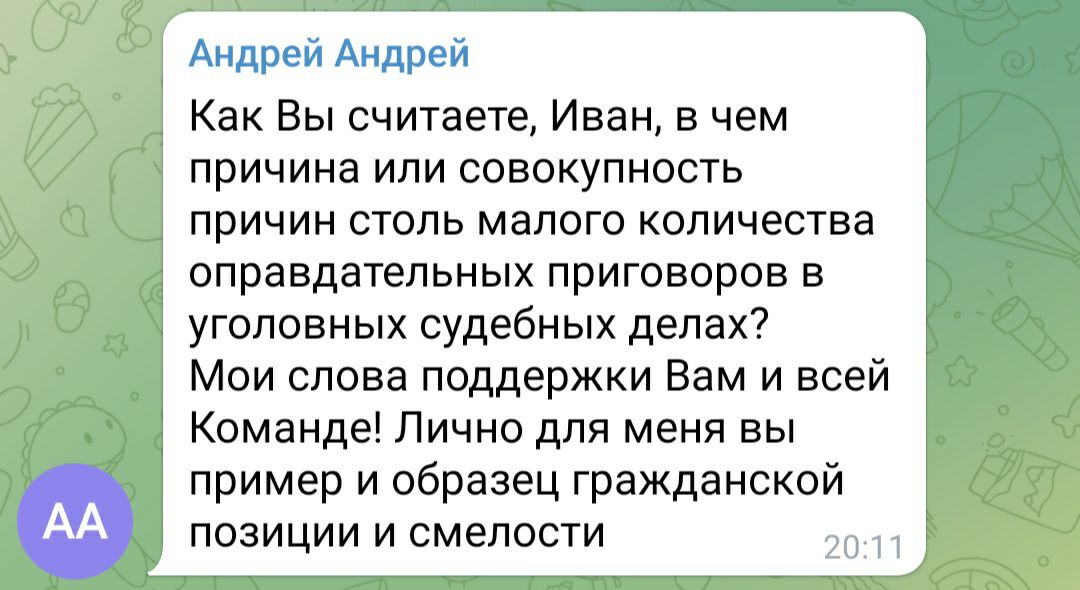 Как Вы считаете, Иван, в чем причина или совокупность причин столь малого количества оправдательных приговоров в уголовных судебных делах?