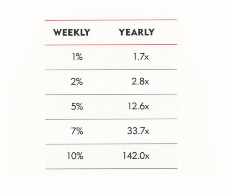 توضیح: در جدول زیر رشدهای هفتگی و معادل رشد سالانهی آنها آمده است. هر X برابر است با رشدی یک برابری یا ۱۰۰ درصدی. برای نمونه اگر شما هفتهای %۵ رشد کنید، در پایان سال ۲.۸ برابر شدهاید به بیان دیگر به صورت انباشته ۲۸۰ درصد رشد داشتهاید.