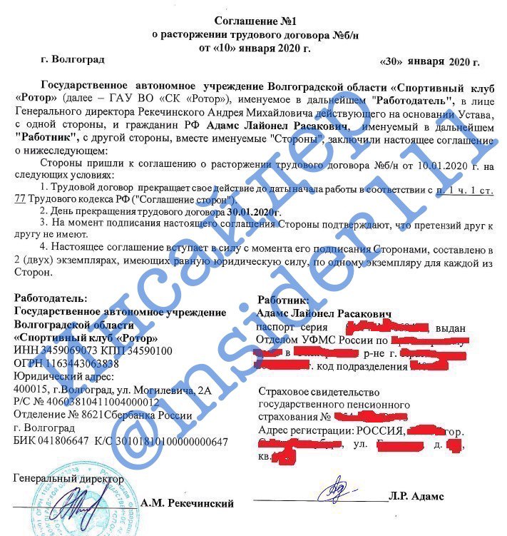 По сообщениям источников, причиной такого развития событий стал цвет кожи футболиста. Несмотря на то, что Адамс родился в Санкт-Петербурге, является воспитанником ЦСКА и даже был заигран за юниорскую сборную России, футболист имеет нигерийские корни и характерный цвет кожи, который не понравится высокопоставленному чиновнику из администрации Волгоградской области. Сообщают об одном из первых лиц региона, который потребовал в срочном порядке убрать Лайонела Адамса из команды. 30 января, взяв под козырек, Андрей Рекечинский исполнил распоряжение и подписал соглашение о расторжении трудового договора с футболистом. Формально договор был расторгнут по соглашению сторон, фактически же это произошло по инициативе клуба, который заплатил Адамсу и его агенту за то, чтоб эта нелицеприятная история не получила огласку.