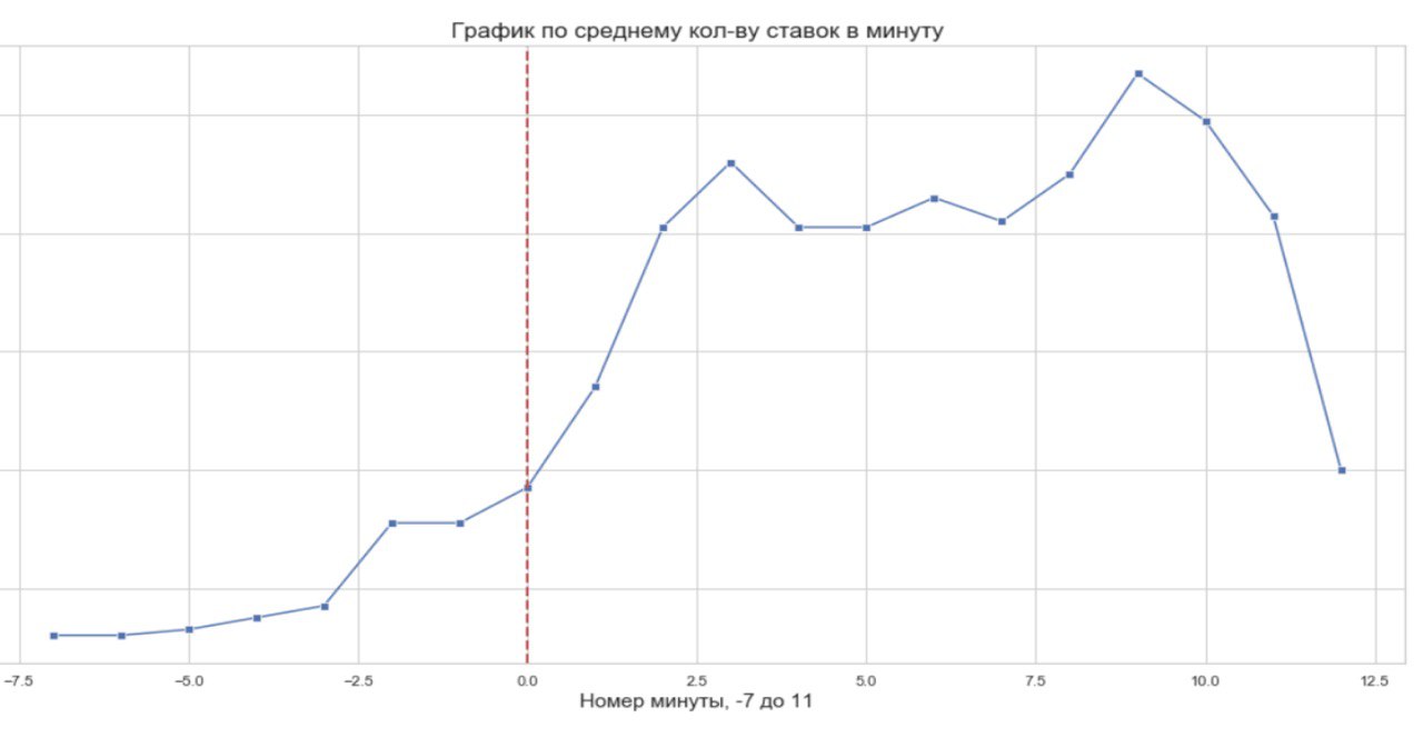 Буквально за пару часов мои умнейшие аналитики сделали поминутный срез по 500 событиям и получили вот такую диаграмму. По понятным причинам не могу показывать ось Y c кол-вом ставок, а вот ось X показывает минуты до и после начала матча. Напомню, что матч в киберфифа длится около 12 минут. 📈