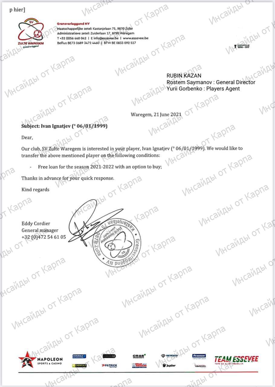 Бельгийский Карп докладывает из Казани: летом 2021 года Зюльте-Варегем направил официальное письмо в Рубин об аренде Игнатьева (эту часть инфы 18 августа того года сообщал Панк) с правом выкупа. Пруф прилагается как илюстрация этого утверждения.