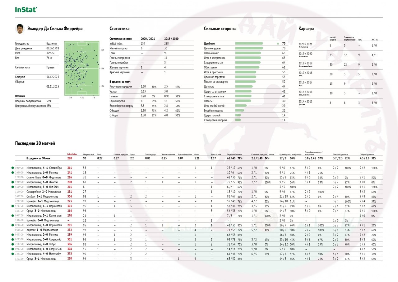 Эвандер в Дании не играет чистого ЦАП, потому что этого просто не подразумевает схема клуба. А «Мидтьюланд» играет по схеме 4-3-3 с одним опорником и двумя центральными полузащитниками. Более того, если «Мидтьюланд» играет в 4-2-3-1 с ЦАП, то на позиции атакующего полузащитника выходит не Эвандер. Бразилец располагается глубже.