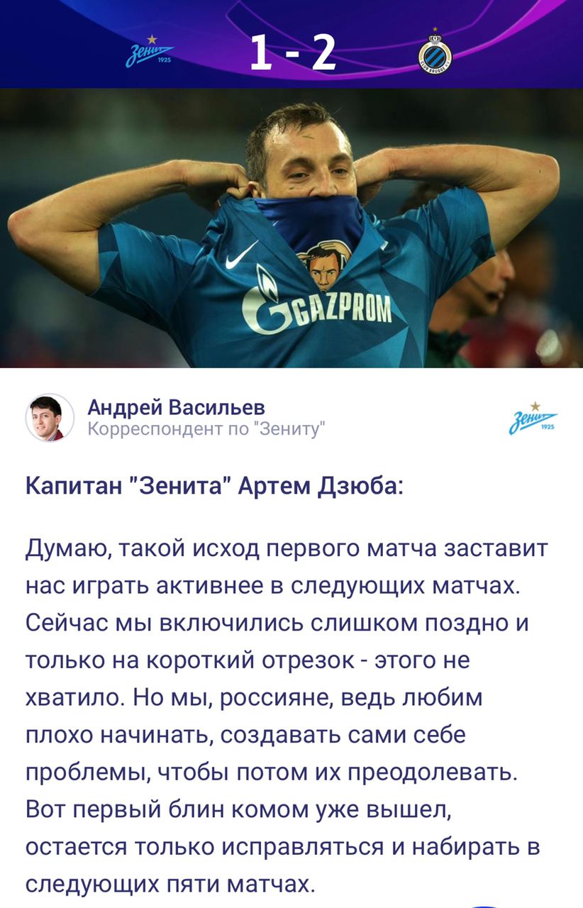 ДЗЮБА о 1:2 от «БРЮГГЕ» в ЛЧ: «МЫ, РОССИЯНЕ, ВЕДЬ ЛЮБИМ ПЛОХО НАЧИНАТЬ»