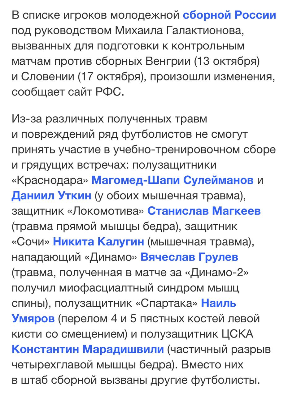 ШАПИ, УТКИН, МАГКЕЕВ, КАЛУГИН, ГРУЛЕВ, УМЯРОВ, МАРАДИШВИЛИ НЕ ВЫЗВАНЫ В МОЛОДЕЖКУ ИЗ-ЗА ТРАВМ