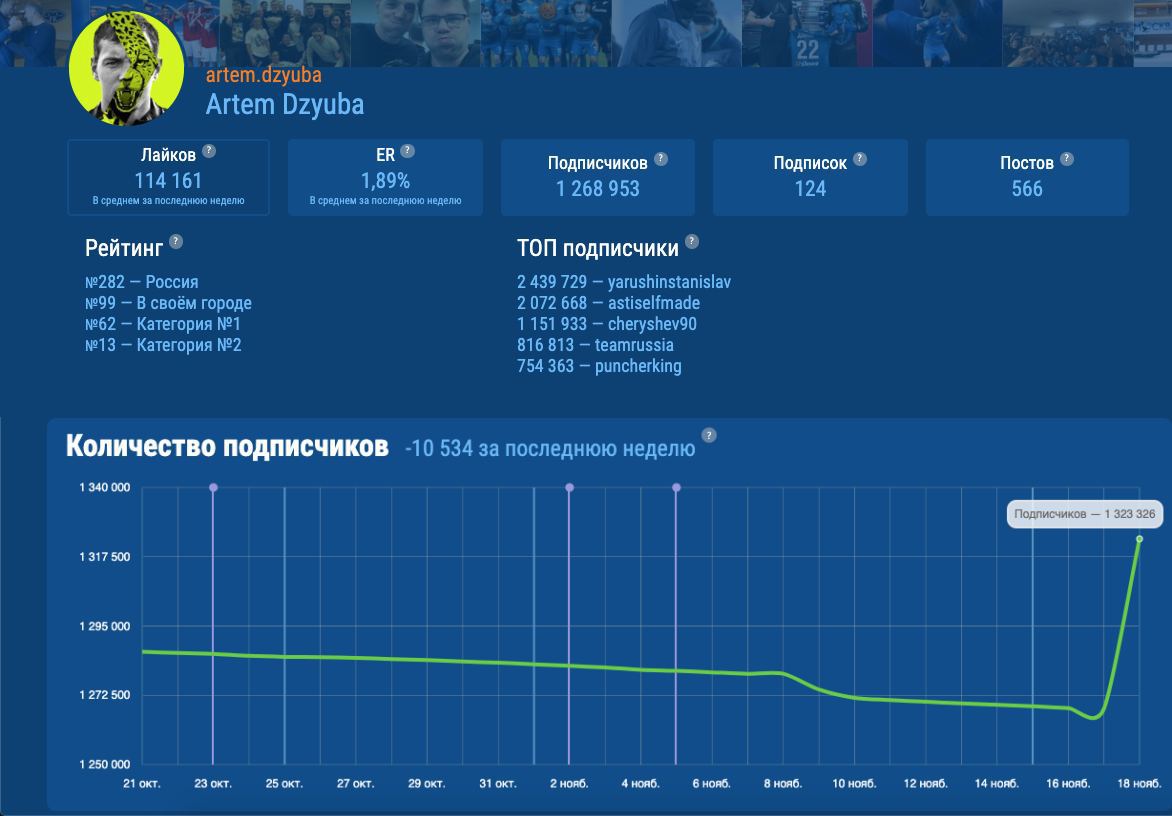 Но что было в последние пару дней? Только новость о том, что Тарасов отнял у него лидерство и бухтения экспертов, что зря Черчесов не взял Дзюбу на ноябрьские матчи. И сразу случился рост, какого не было в дни главной победы российской сборной. Можно предположить, что дело в истории со слитым видео. Но оно появилось почти 2 недели назад, а новости в наше время столько не живут. Да и эта история, скорее, пошла ему в минус, потому что за первые дни от Артёма ушли ещё 10 тыс. подписчиков.