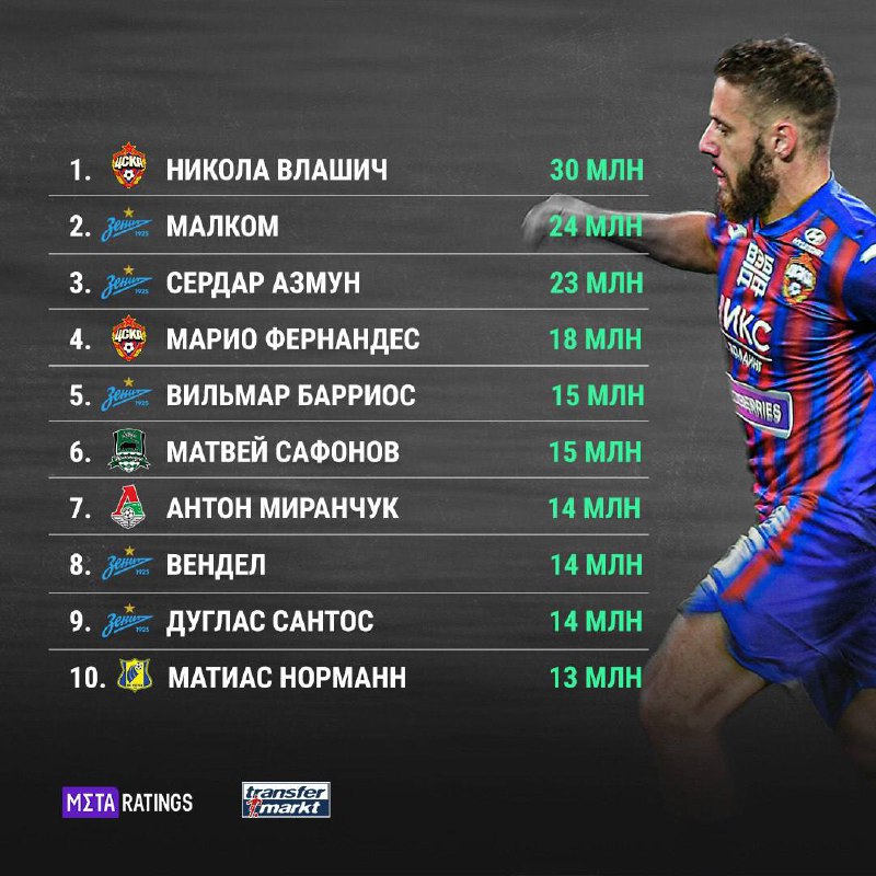 Влашич в топе за €30, Малком дороже Азмуна на единицу, Барриос дешевле Марио аж на трешник, Сафонов неожиданно дороже Миранчука, а Норманн немного дешевле Вендела и Дугласа Сантоса.