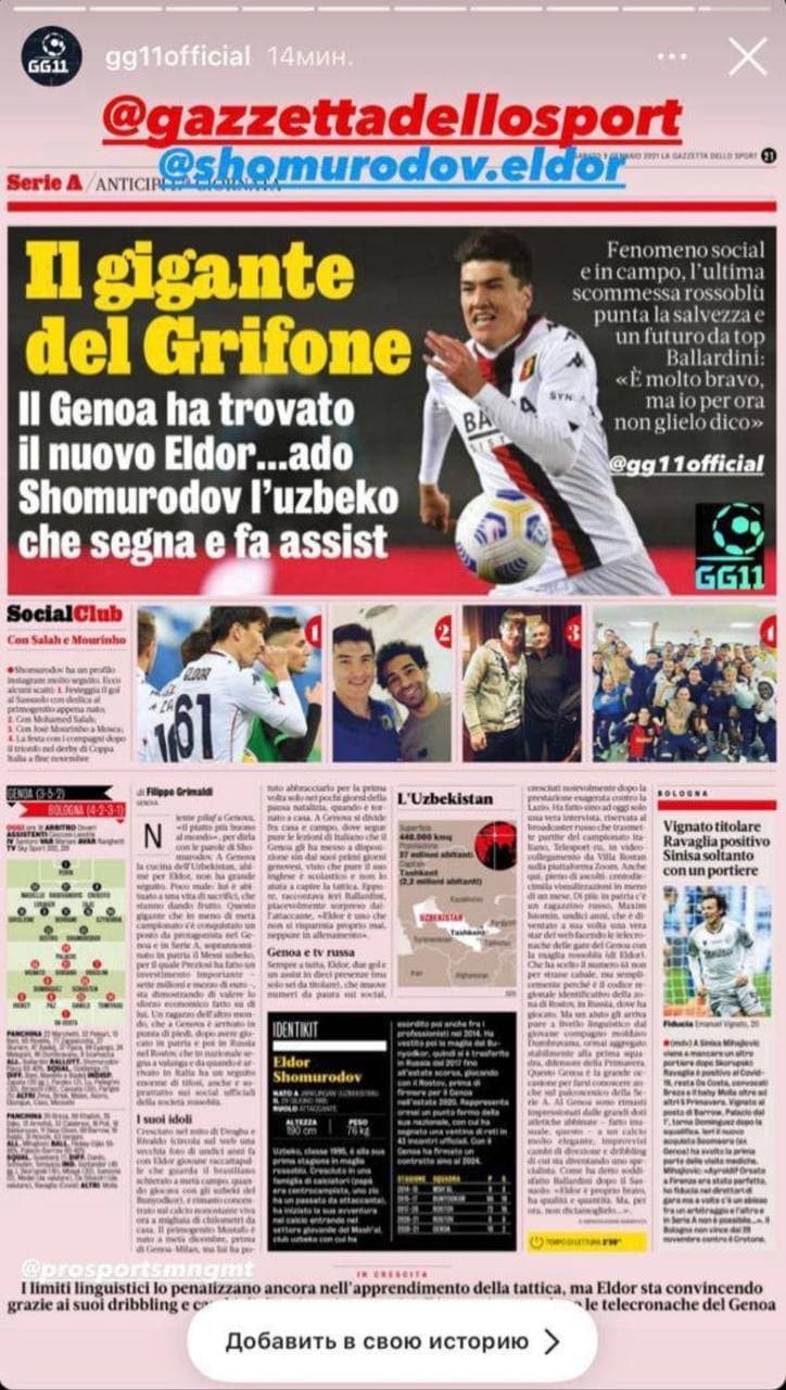 Автор газеты Гримальди подготовил свое описание Шомы. В первую очередь он обращает внимание на развитые соцсети игрока: в инсте 25-летнего узбека пикчи с Салахом и Моуриньо, 133к подписоты и по 30к лайков за пост. Там отлично восприняли, когда первый гол он посвятил своему первенцу — Мустафе. Отдельно журналист сообщает о всплеске интереса к «Дженоа» из России и Узбекистана в последних матчах. Из Москвы за Шомуродовым следит маленький ютубер Истомин, который комментирует матчи итальянцев в красно-синей футболке, подаренной футболистом.