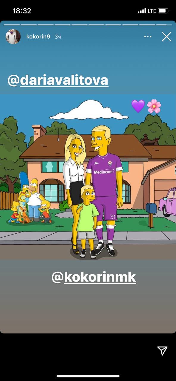 Всемирно известный нападающий «Фиорентины» опубликовал в инсте картинку в стиле легендарных Симпсонов. На переднем плане чета Кокориных: супруга в мини, сын с большим пальцем вверх и сам Коко весь в фиалковом — позируют на фоне дома. Оригинальных же Симпсонов при этом задвинул глубже на фланг.