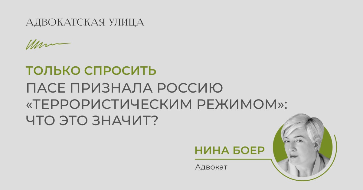 В четверг Парламентская ассамблея Совета Европы (ПАСЕ) призвала членов Совета считать Российскую Федерацию «террористическим режимом». В той же резолюции говорится, что угрозы применения ядерного оружия «несовместимы с обязанностями ядерной державы, имеющей постоянное место в Совете Безопасности ООН». Для рубрики #ТолькоСпросить «Улица» попросила адвоката Нину Боер объяснить, какие у этого решения могут быть последствия.