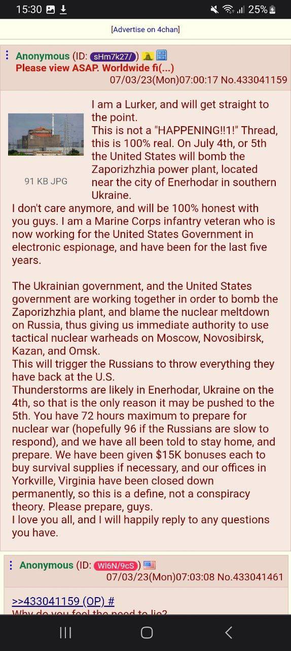 Рискнём предположить, что Советник гендиректора «Росэнергоатома» Ренат Каарча, говоря о предполагаемом ударе по Запорожской АЭС в ночь на 5 июля, ссылается на данные англоязычных имиджбордов, где форсятся слова некоего ветерана морской пехоты, который как раз и утверждает, что удар по АЭС будет нанёс в ночь на 5 июля. Первым о треде написал телеграм-канал Поздняков 3.0. https://t.me/c/1732054517/20781