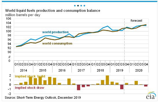 ▪️Добыча сырой нефти в США в среднем в 2020 году составит 13,2 мб\д, что на 0,9 мб\д выше чем средний уровень добычи 2019 года. Что любопытно, из-за снижения буровой активности Минэнерго прогнозирует замедление добычи в 2020 году.