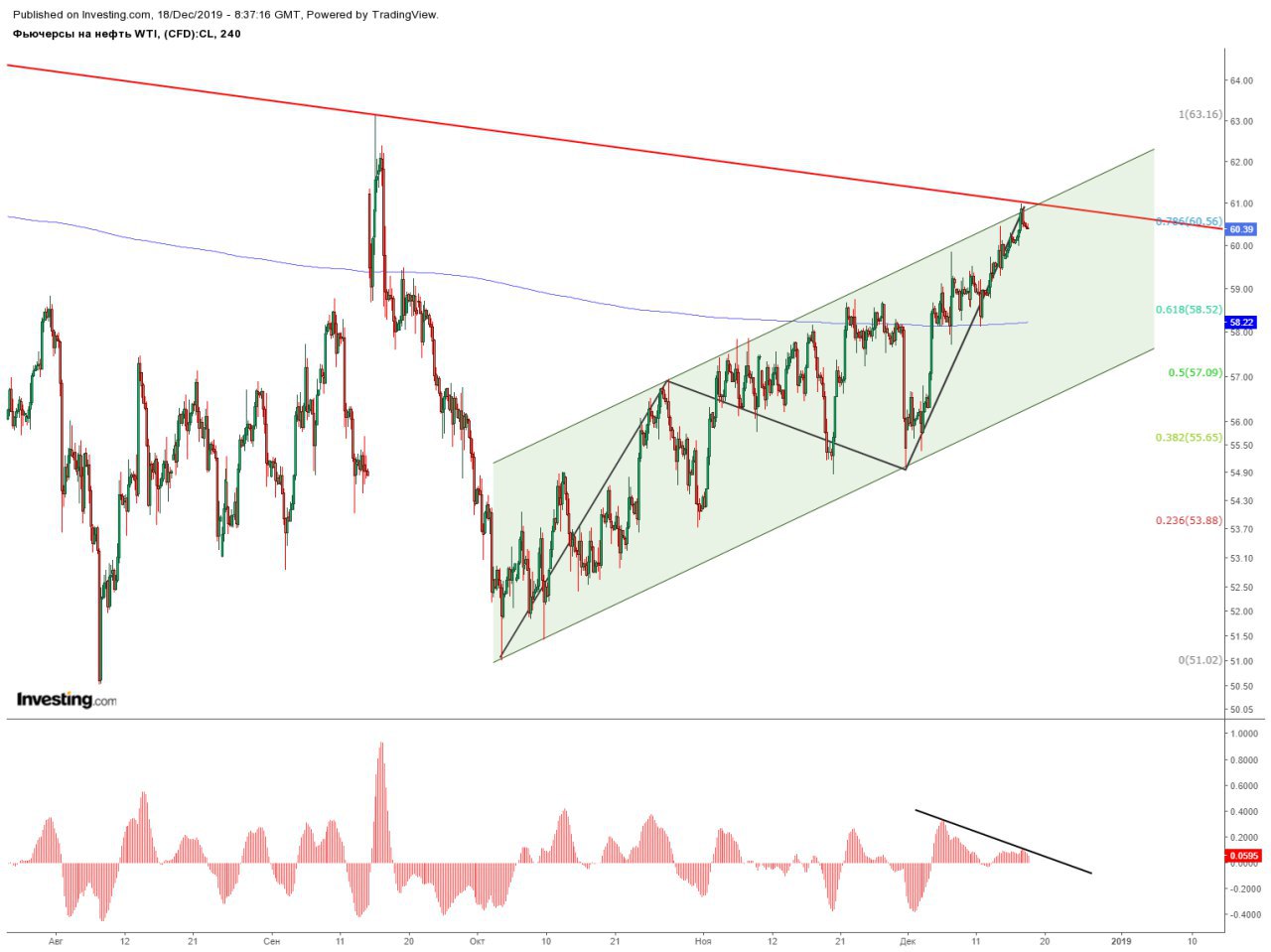 На 4-часовом масштабе WTI цена подошла к трендовой диагонали, также мы в точке верхней границы восходящего фрактального канала и последнего медвежьего редута по зонам Фибоначчи. Рынок уже вернул 78% потерь с момента слива середины сентября. При этом, осциллятор рисует устойчивую дивергенцию.