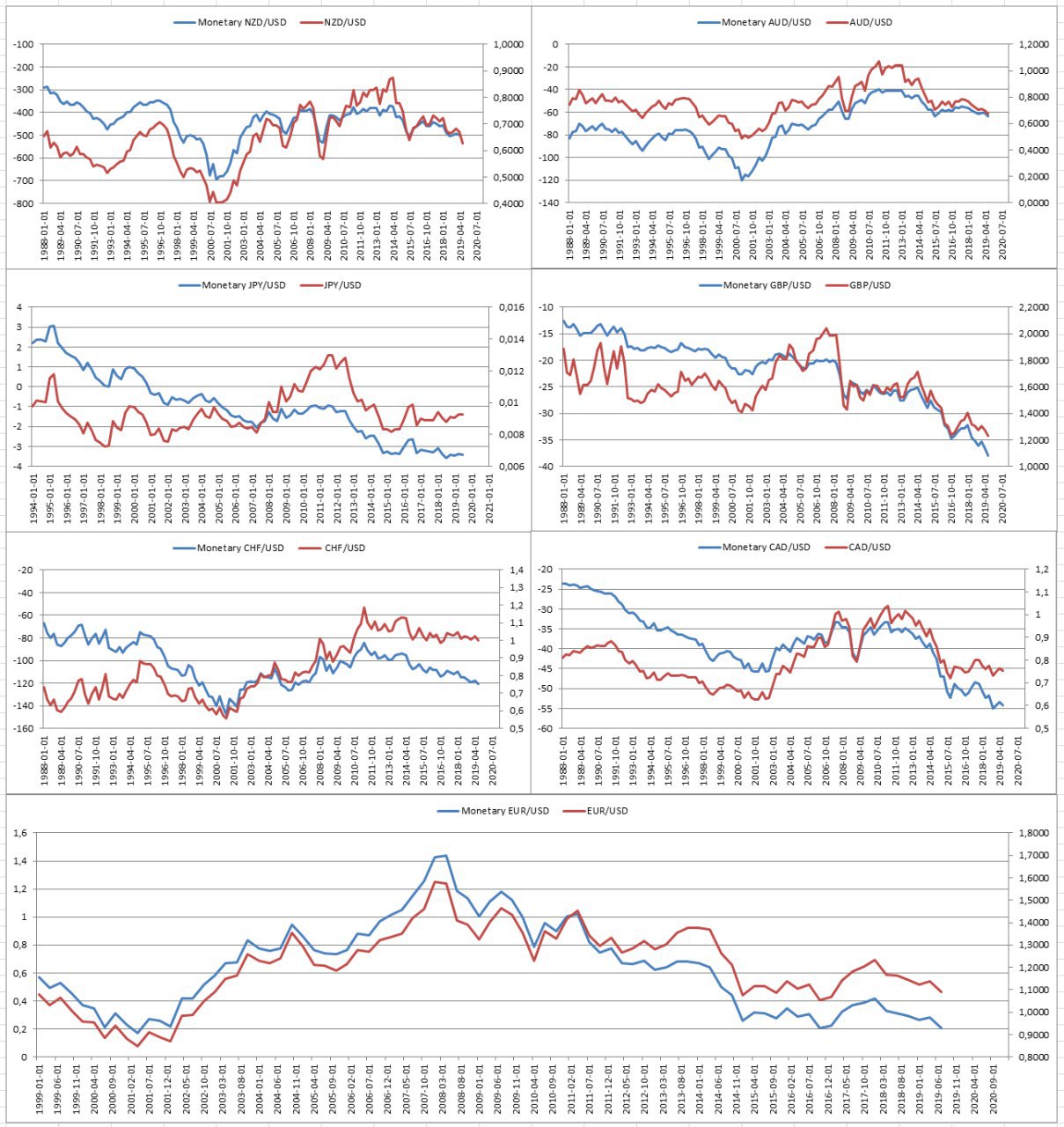 Для экономиста валютный курс - это соотношение эндогенных и экзогенных факторов двух стран. Вчера мы рассмотрели экзогенное влияние на ценообразование валютного курса, а именно условия торговли. На этот раз мы рассматриваем эндогенные причины ценообразования валютного курса, на основании соотношений инфляции, совокупных расходов и денежной массы. На картинке модели нанесены синей линией.