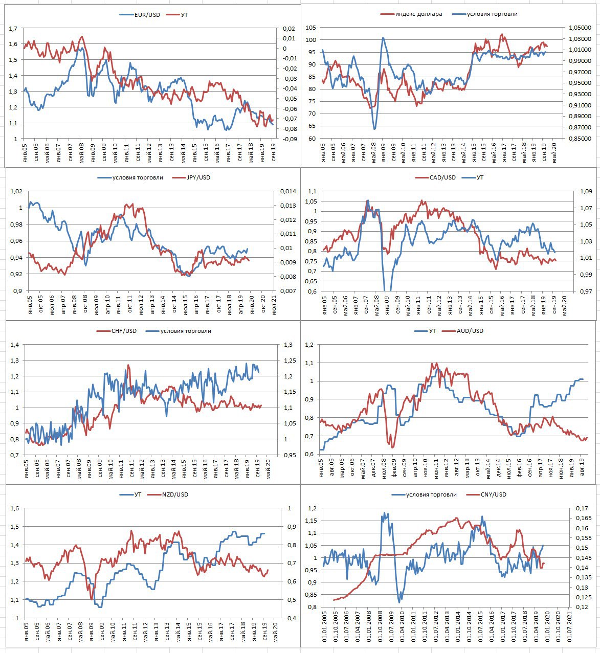 ✔️Изумительная корреляция условий торговли и торгово-взвешенного индекса доллара (крайняя верхняя справа). Совершенно оторван от теории швейцарский франк (вторая левая снизу). Самые злостные девальваторы это Н.Зеландия и Австралия, курсы валют этих стран сильно занижены, особенно нечесно выглядит австралийский доллар (справа от франка). При этом, ЦБ данных стран используют именно монетарное давление на курсы. Даже китайский юань менее дешев (правая нижняя).