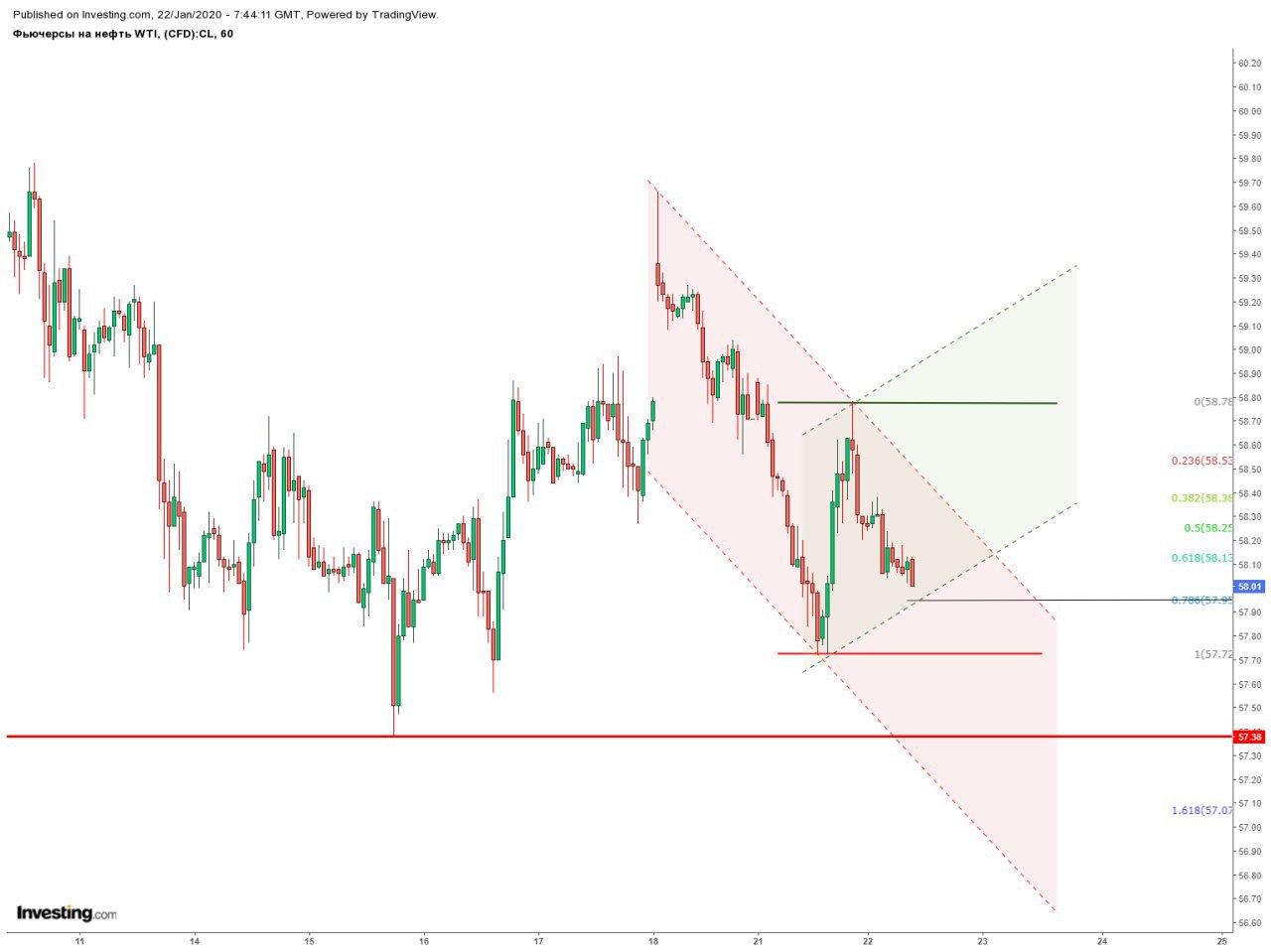 ▪️Вчера цена подошла к лоям прошлой недели, но сильно отскочила, если мы не отобьемся от 58 по WTI и пойдем ниже вчерашнего лоя, активизируется нисходящий фрактальный канал с нижней границей в районе 56,8.