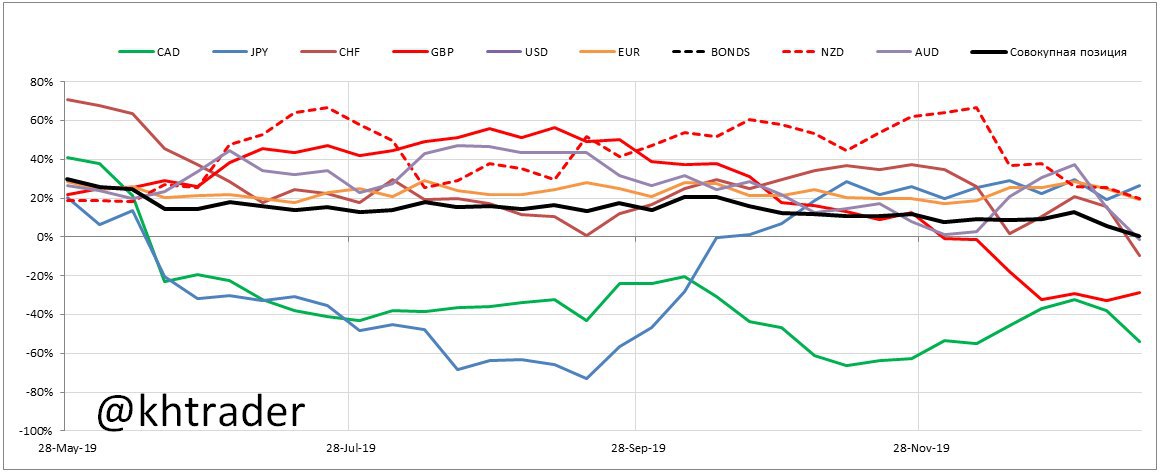 ▪️На уровне позиции по новозеландцу находится позиция по евро (желтая) пока динамика показателя остается плоская.