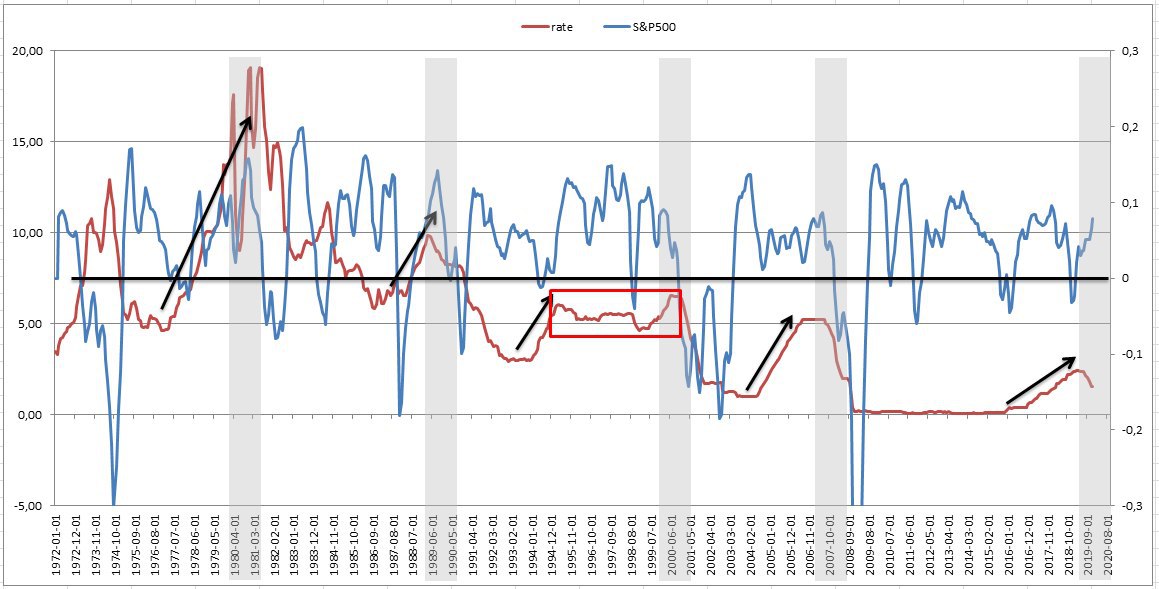 На картинке динамика рыночной (эффективной) ставки в США и фондовый индекс S&P500 в динамике (отклонения от среднегодовой в процентах)