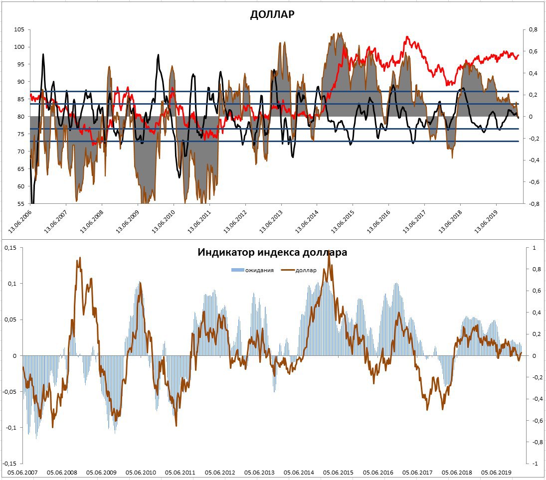 ▪️На верхней картинке серой областью нанесена авторская модель индекса доллара, как видим, показатель сильно разошелся с котировками DX образую устойчивую дивергенцию.