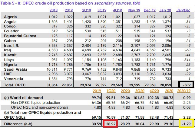 ▪️Страны ОПЕК сократили добычу нефти в январе на, 509 тб\д (обведено черным), добыча составила 28,86 мб\д., это на 1,3 мб\д ниже, чем годом ранее. При том, что среднесуточный спрос на нефть ОПЕК в 2020 году ожидается на уровне 29,3 мб\д.