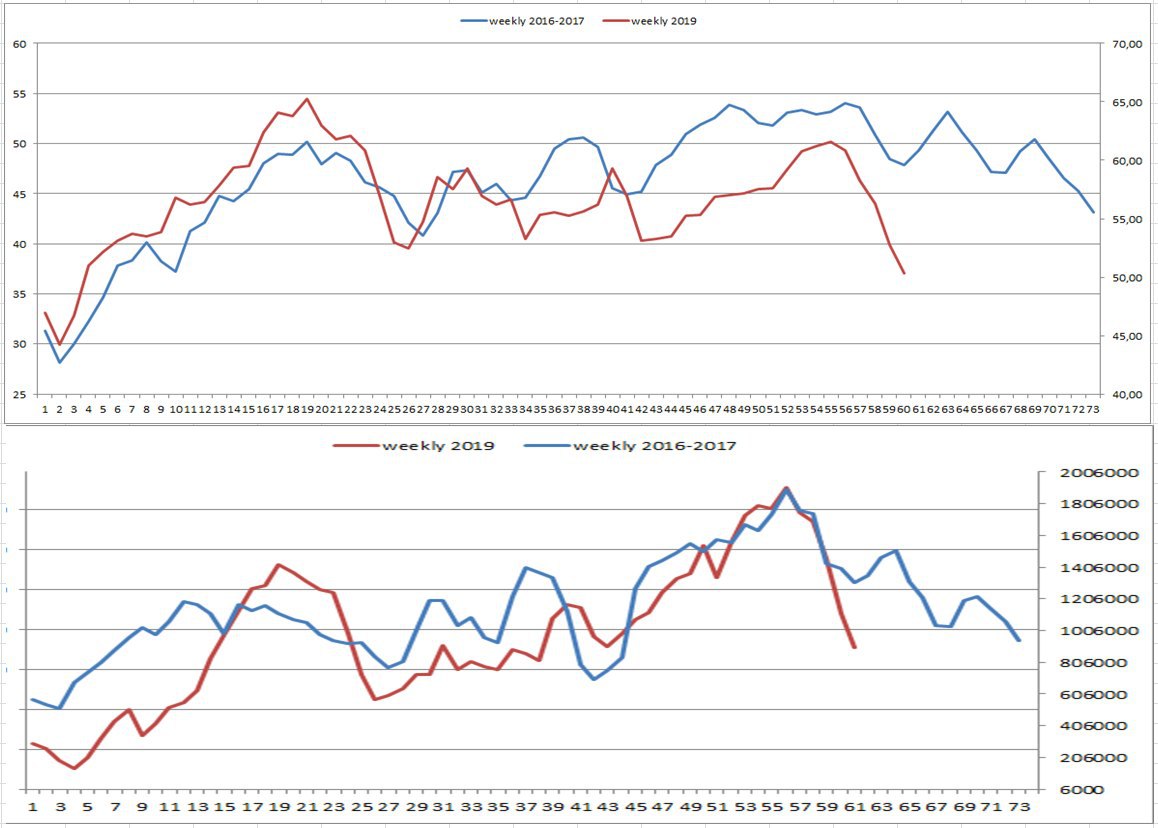 👉Как видим, ценовая динамика весьма схожа во времени (горизонтальная ось - кол-во недель), но вот движение по оси цены сейчас более динамично, что сжимает окончание коррекции, а значит и время разворота можно ожидать ранее, чем это было в 2017 года. Тогда разворот произошел в начале лета.