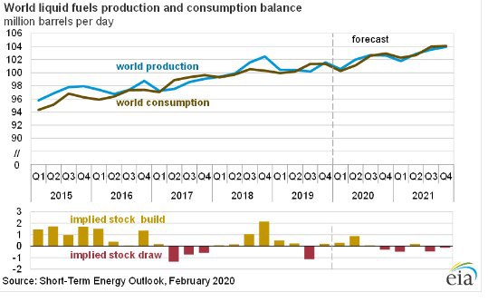 ▪️Любопытно, но Минэнерго прогнозирует, что ОПЕК снизит добычу нефти на 500 тб\д с марта по май, а добыча ОПЕК в 2020 году составит 28,9 мб\д, что на 300 тб\д ниже прогноза января. Соглашение о сокращении добычи продержится 2020-2021 годах, так считает Минэнерго США.