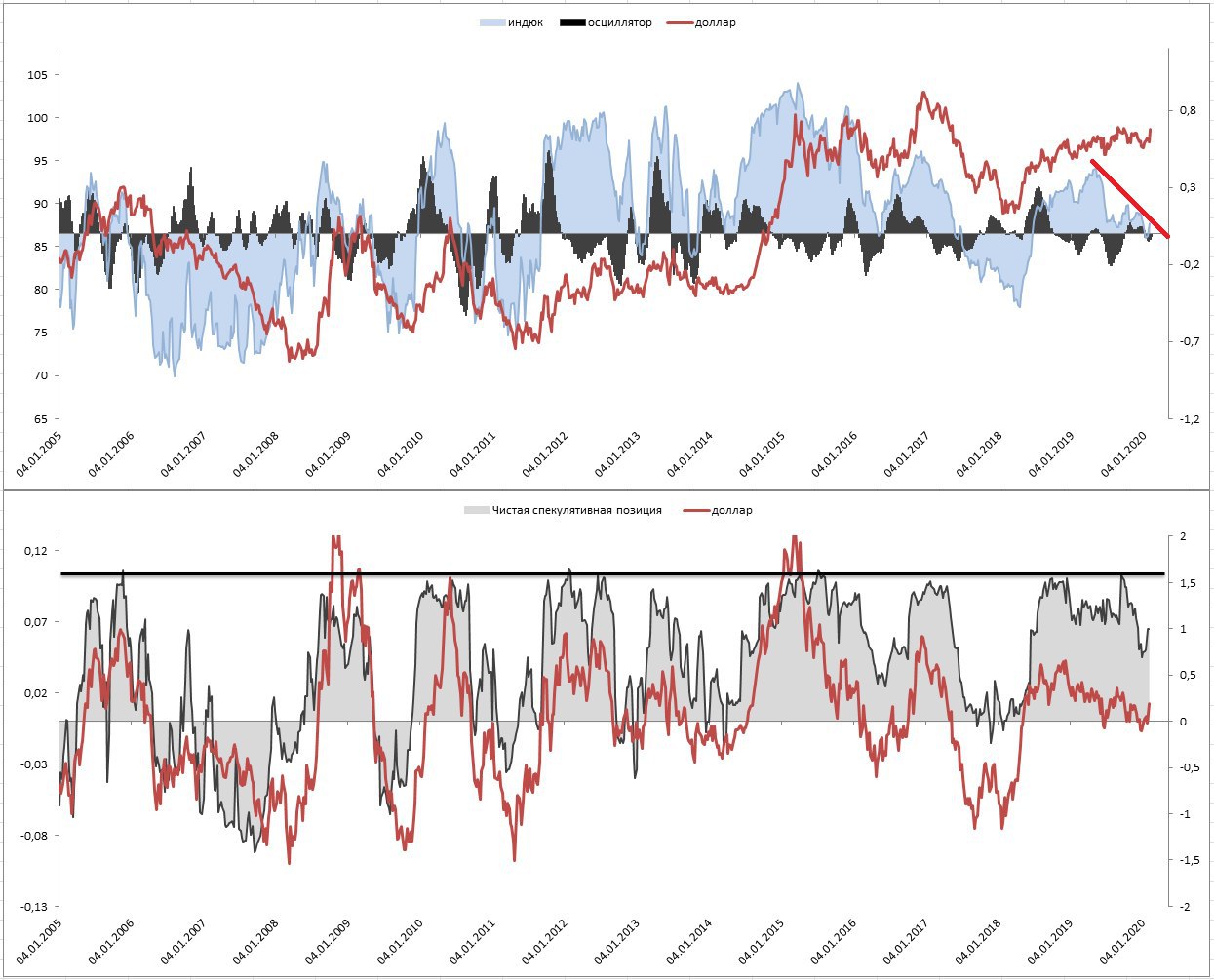▪️На нижней картинке, серая область - это чистая спекулятивная позиция, а красная - динамика DX в процентном отклонении от квартальной средней (скорость изменения цены). Вопросы, кто движет рынком - снимаются. Мы наблюдаем локальный рост спекулятивной позиции, что приводит к росту котировок. Корреляция между показателями устойчивая. Плохо, что к пикам далековато, рост может затянуться до месяца с целью 100 пунктов.