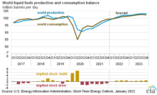 Предложение нефти в декабре составило 98,27 мб\д., без существенных изменений относительно ноября. В 2022 году ожидается рост предложения на 5,5 мб/д и среднесуточное предложение нефти оценивается в 101,05 мб/д.