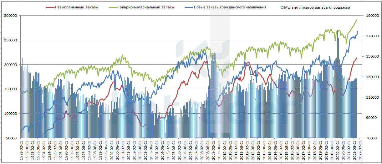 ▪️Синяя линия — это новые заказы на долгосрочные товары гражданского назначения (без оборонки и транспорта), которые в декабре продолжили расти, в очередной раз переписав исторический максимум.