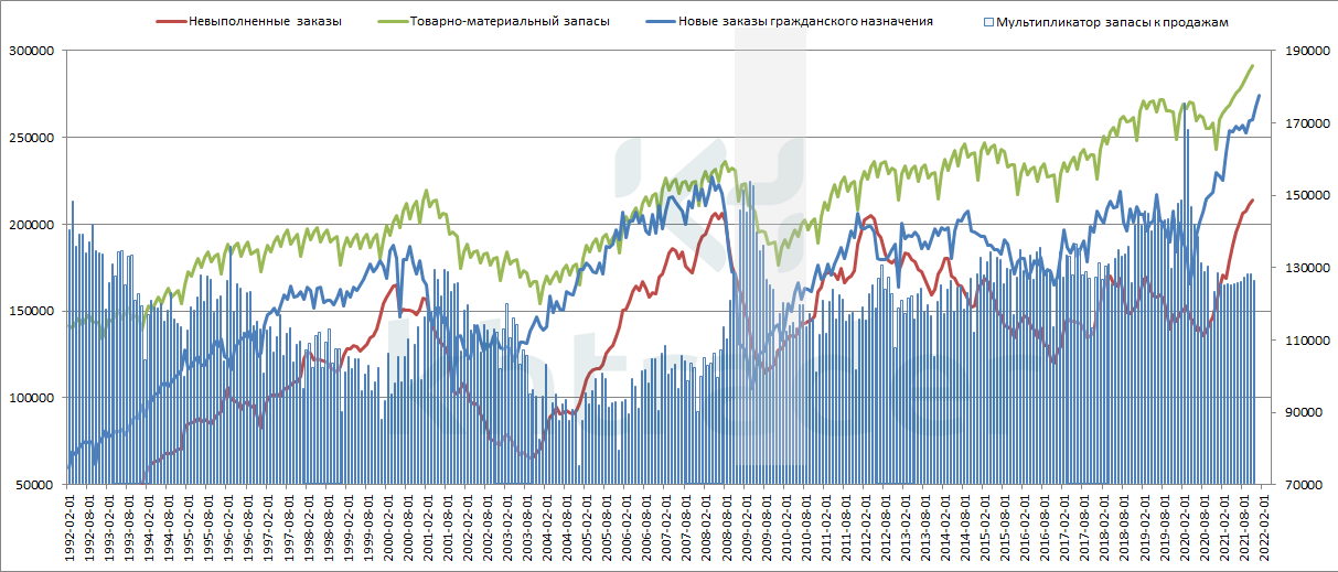 ▪️Красная линия – невыполненные заказы на гражданские товары; в январе показатель также продолжает расти, снова переписав 30-летние максимумы: производители товаров не справляются с потоком заявок.