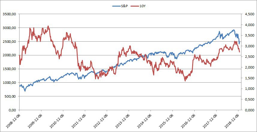 #пропорции ...отток капиталов с корпоративных активов создал взрывной спрос на 10-летние облигации Госдепа. Ставки улетели вниз (красная). Синяя - индекс S&P500.