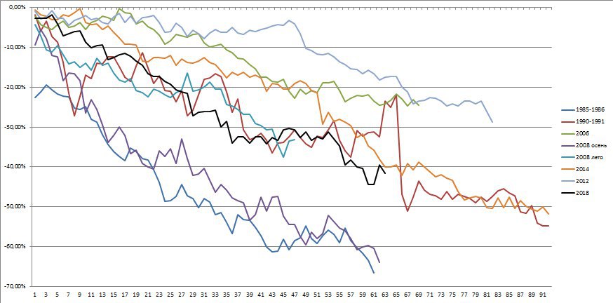 #нефть Действующий цикл падения (черная линия) на нефтяном рынке пока уступает по темпам только падению 1985-1986, 2008 года. И ценовые, и временные экстремумы не преодолены. Здесь, кстати, есть над чем подумать, по времени еще можем падать 3-4 недели, а ценовые уровни ниже еще на 20% от экстремума (35-30 по Лайт).