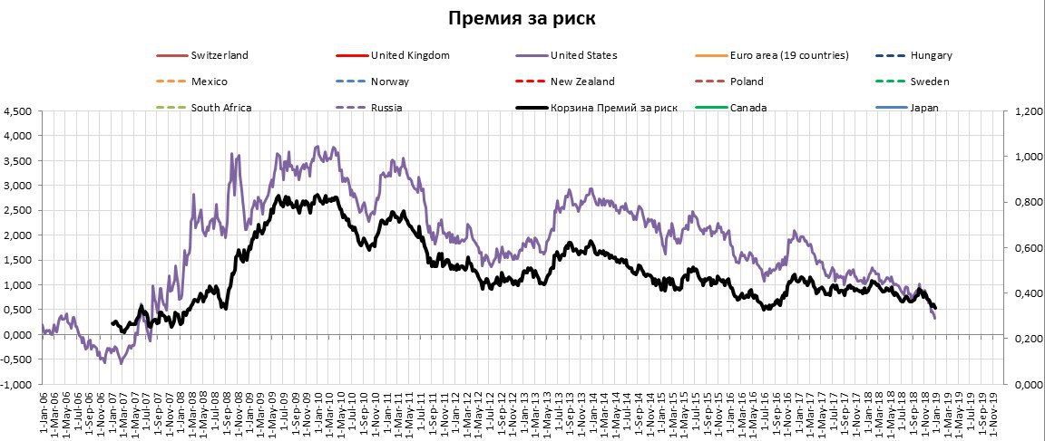 #экономика Из-за роста ставок денежного рынка и падения ставок рынка капиталов (спровоцировано перетоком ликвидности в защитные активы), премия за риск на финрынке США упала до уровня 2007 года (сиреневая), что было потом все помним. Комбинированый показатель по развитым странам находится выше показателя США (черная) и пока не спустился даже ниже уровня 2016 года.