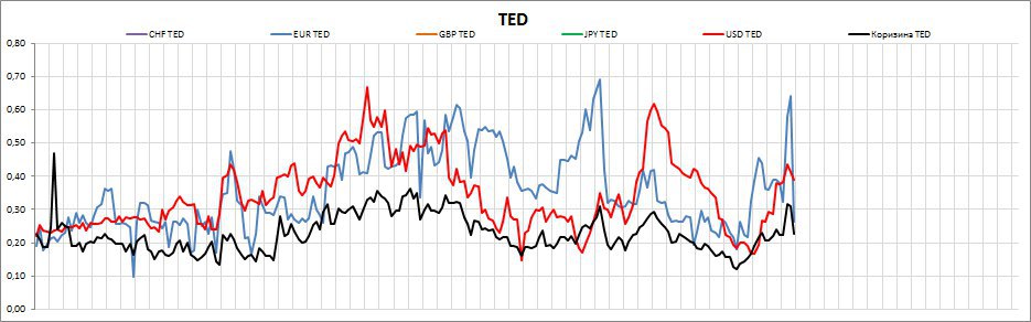 Показатель в США (красная) припал незначительно, а вот по Евро (голубая) прям рухнул, что вселяет оптимизм, т.к. фининституты будут охотнее оборачивать средства в экономике.
