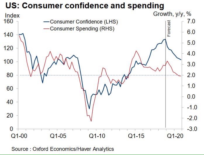 #экономика Оксфорд прогнозирует спад потребительского доверия и настроений в 2019 году. Из этого следует, что сторона спроса в ВВП будет падать, нет спроса, нет роста. (На картинке)