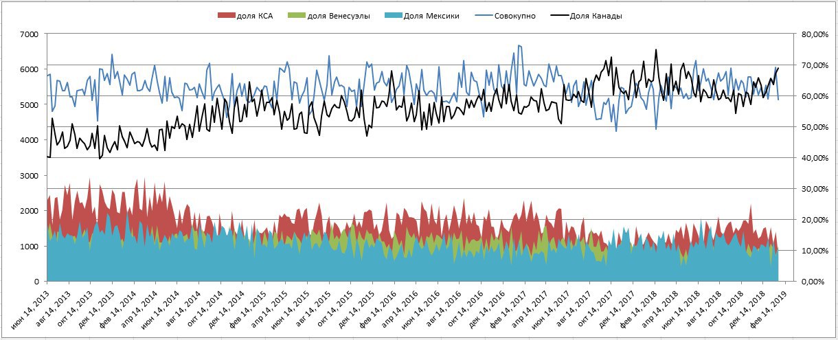 Надежда, что потенциально-выбывшая нефть Венесуэлы, будет компенсирована Канадской или Саудовской поставкой, также не имеет достаточного уровня доверия. Канада хоть и снизила квоты по сокращению добычу из-за низких цен, но всего на 75 тб\д. Беда также с транспортировкой из Канады, ведь трубопроводы не обновлялись давно, а новые не запущены. Также Канаде нужны цены гораздо выше, для производства синтетики с битума.