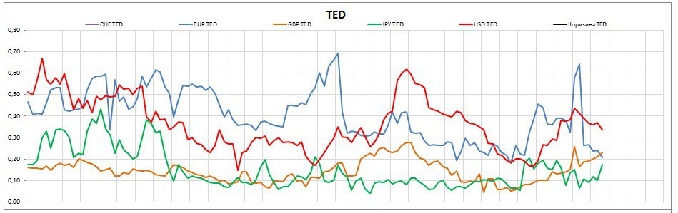 Ситуация по йене радует, т.к. мы за шорт GDP/JPY, а вот GBP/CHF через ТЕД-спред не очень, т.к. по франку спред на минимумах, так что фунт может порасти против франка. Подождем...