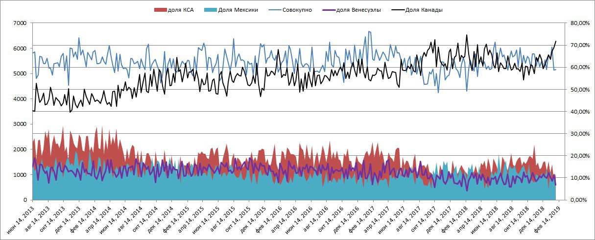 #нефть Продолжаю следить за структурой импорта в США со стороны четырех основных поставщиков Канада+КСА+Венесуэла+Мексика.