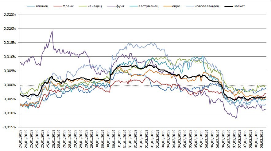 Итак, как видим с картинк весь валютный рынок, дружно, в медвежей зоне (под нулевой отметкой). Йена, канадский доллар сильнее рынка, а фунт слабее рынка. В Британии эпопея с Брекситом продолжается, срок выхода из ЕС приближается (где-то в марте), а согласованности в рядах Британского параламента нет. При этом парламент подписал соглашение о невозможности нового референдума, а суд ЕС дал добро об одностороннем выходе Великобритании из состава ЕС. Вот к этому пока все и идет.