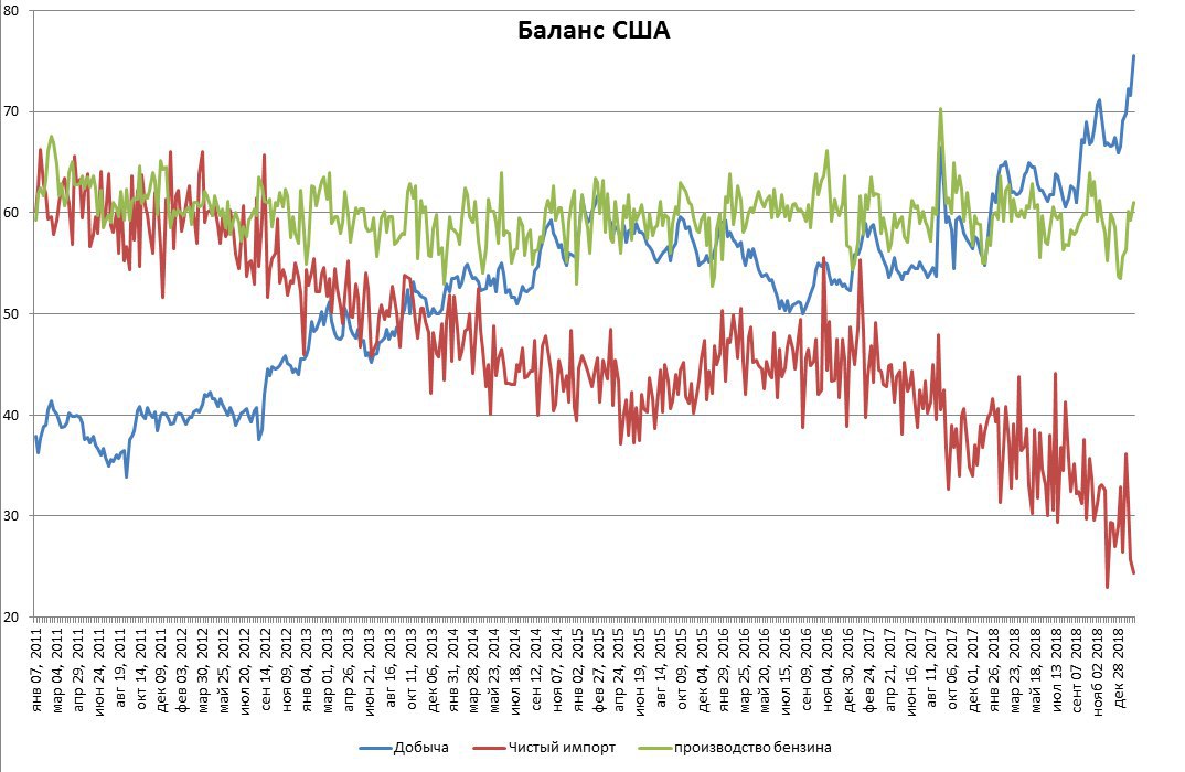 Учитывая, что сейчас потребление нефти ниже на 2,5-3 мб\д от прогнозируемых Минэнерго США на 2019 год (около 19 мб\д со стороны НПЗ), а экспорт сырой нефти ниже на 1,2 мб\д (планируется около 4 мб\д в 2019), то примерно рост спроса в 2019 году от текущих вырастет на 3-4 мб\д. При этом прогноз по добыче в США в 2019 году средняя будет на 12,5 мб\д, что всего на 600 тб\д выше текущей добычи. Остальное нужно импортировать.