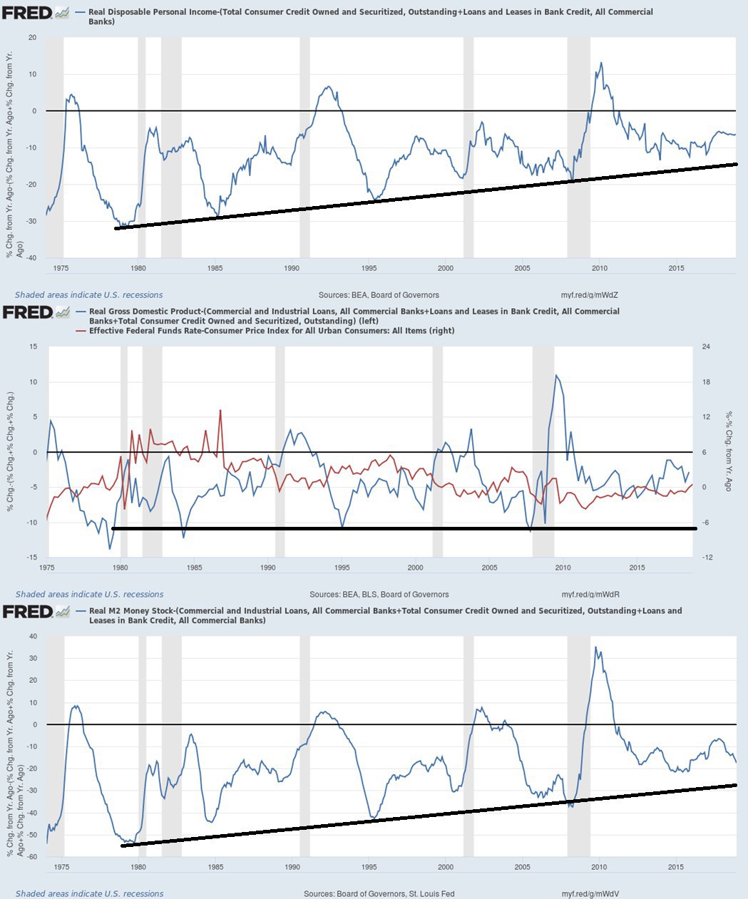 Нижняя картинка - разница темпов реальной денежной массы (М2) выраженной от года к году и темпов совокупного кредита.