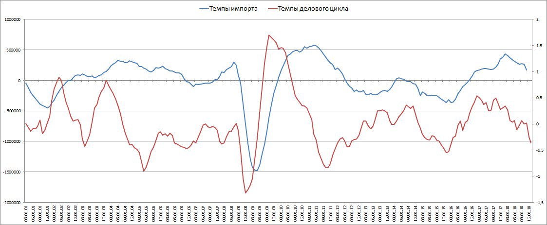 Как видим с картинки, ипорт ведомый, темпы делового цикла ведущие. Показатели по внешнеэкономической деятельности запаздывающие, и данные выходят с временным лагом.