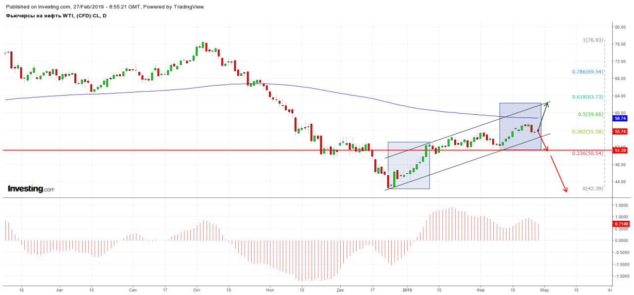 Вероятно рост продолжится на слухах. В случае слома фрактала (выход вниз) и пробоя поддержки на 51,3 сценарий полностью ломается и медведи возьмут нефть в свои лапы.
