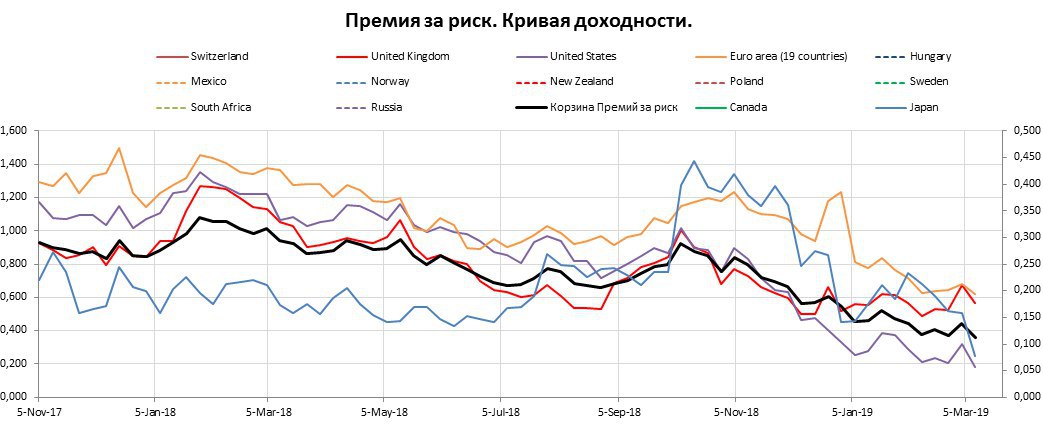США по данному показателю догоняет Япония, на картинке голубая линия. Причем падение очень стремительное. Экономика страны ухудшается, это давит на Банк Японии который утюжит весь финрынок, а в условиях роста макроэкономического риска не только в стране, а и в мире, заставляет местные фининституты перекладываться в защиту - 10-летние облигации. Это и уплощает кривую. Вообще для японской йены наступают не лучшие времена, ибо ведущие центральные банки запускают новую волну QE, а ФРС, как минимум останавливает QT. В итоге это ведет к росту аппетита к риску, весь рынок йеновых активов останется за бортом.